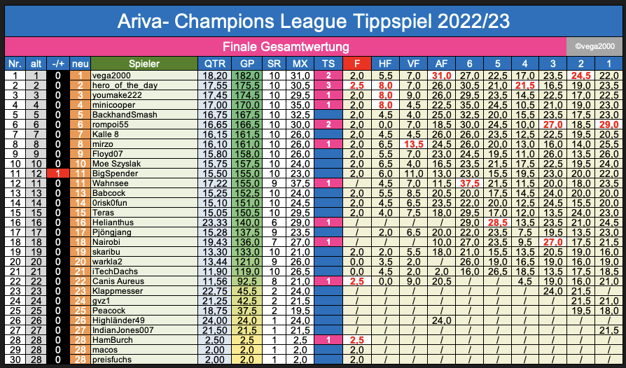 ... Organisation der hiesigen CHAMPIONS League ! - Auf ein Neues in der kommenden Saison 2023/24, in welcher dann hoffentlich ein paar mehr Fussball-Tippfreunde wieder fröhlich werden mittippen wollen ...