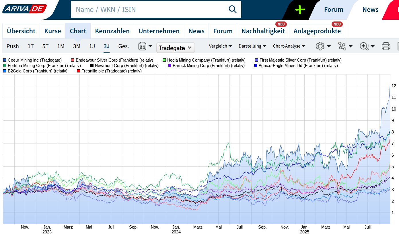 Im 3 Jahres Chart absolut vorraus. Der größte Silberproduzent der USA geht langsam los. Das bisher war nur der Anstieg auf den alten Normalkurs. Die Kosten seitdem 2020 stark investiert wurde drückten die Kurse und das rechnet sich jetzt. Coeur hat zur richtigen Zeit investiert und kann jetzt dick Geld verdienen. Das zeigt sich auch im Chart. Anfang 2024 wurde das teure Projekt erfolgreich zum Laufen gebracht und seitdem läufts. Dazu der Preisanstieg bei den EM und der Laden brummt. Dabei ist 2025 das erste reguläre Betriebsjahr und die Kohle läuft jetzt erst richtig rein.