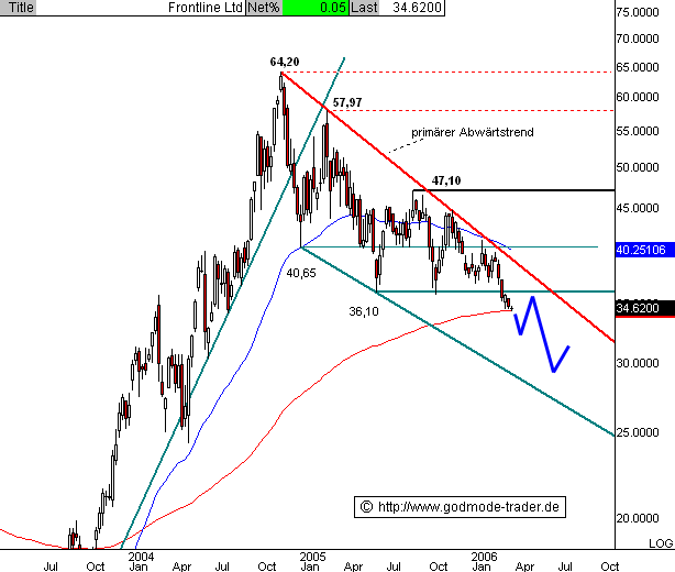 Rückblick: Die FRONTLINE Aktie konnte bis in das Jahr 2004 eine bemerkenswerte Rallye absolvieren. Die Konsequenz daraus war ein neues AllTimeHigh (ATH) bei 64,20 $.Seitdem befindet sich die Aktie in einer "schmerzhaften" Konsolidierungsphase, die nahezu eine Halbierung der Bewertung verursacht. Entsprechend der Eingangsanalyse befindet sich die Aktie aber in der erwarteten Abwärtsbewegung in Richtung 33,00 $.